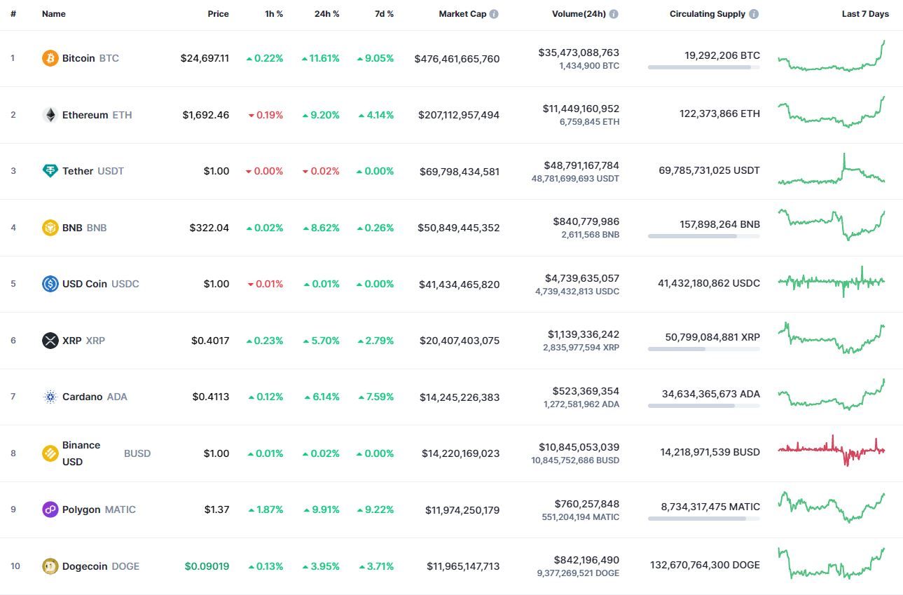 В топ-10 самых капитализированных криптовалют лучший результат за сутки зафиксирован у биткоина (+11,61%). В рамках недели активнее других рос Polygon (+9,22%). В течение 24 часов и последних семи дней все криптовалюты, за исключением стейблкоина Tether, продемонстрировали позитивную динамику.