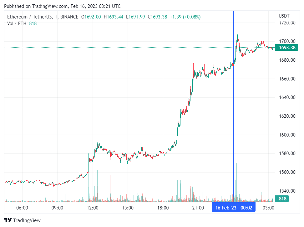Вторая по капитализации криптовалюта Ethereum также начала день с роста. По состоянию на момент написания обзора, монета торгуется по $1693 (1 токен в рублях — ₽126,107).