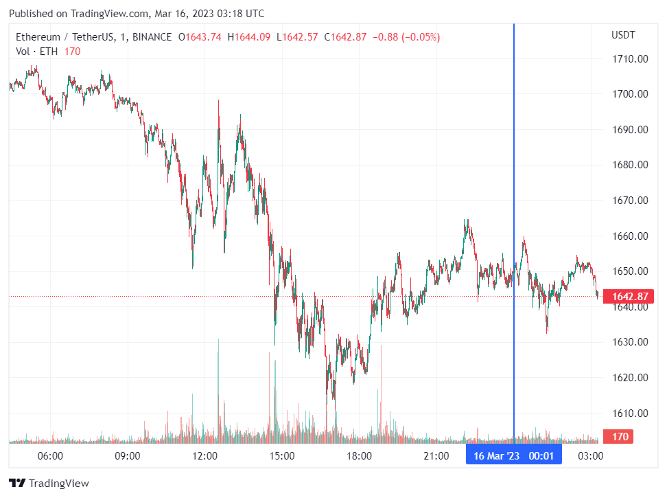 Вторая по капитализации криптовалюта Ethereum также начала день с бокового движения. По состоянию на момент написания обзора, монета торгуется по $1642 (1 токен в рублях — ₽125,710).