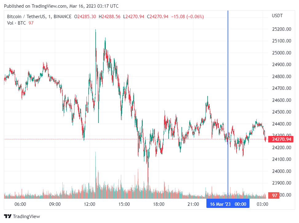 Биткоин (BTC), по данным ресурса CoinMarketCap, начал четверг с бокового движения. По состоянию на 06:18 (МСК), криптовалюта торгуется по $24 270 (1 токен в рублях — ₽1,856,004). Минимум биткоина за 24 часа — $23 964, максимум — $25 240.