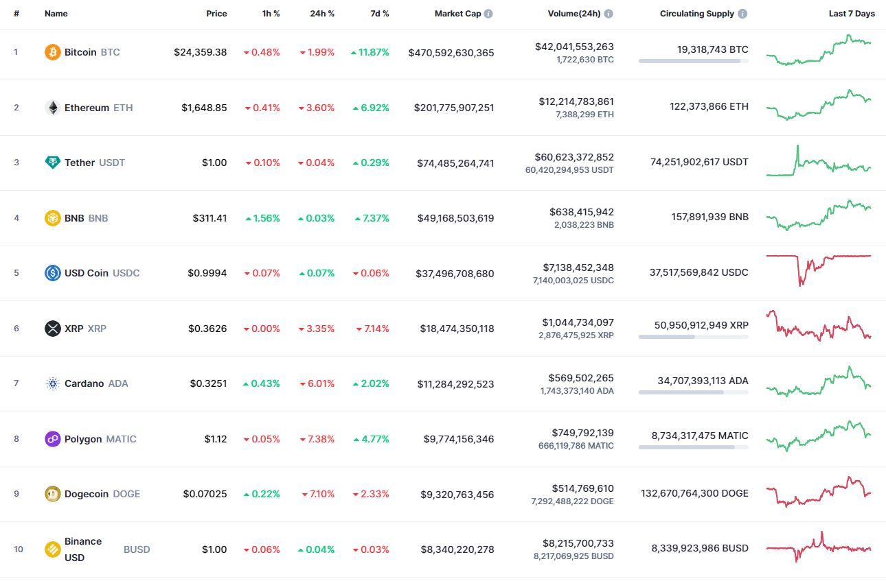 В топ-10 самых капитализированных криптовалют, в рамках 24 часов, рост продемонстрировали только стейблкоины. Наибольшие потери зафиксированы у Polygon (-7,38%). Лучший результат за неделю продемонстрировал Binance Coin (+7,37%). Активнее других в рамках последних семи дней терял в цене XRP (-7,14%).