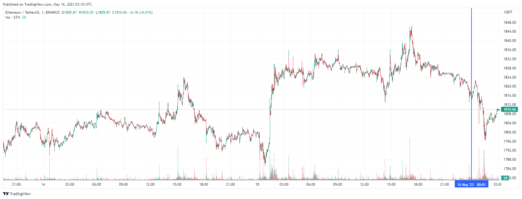 Вторая по капитализации криптовалюта Ethereum также начала день с падения. По состоянию на момент написания обзора, монета торгуется по $1810 (1 токен в рублях — ₽143,478).
