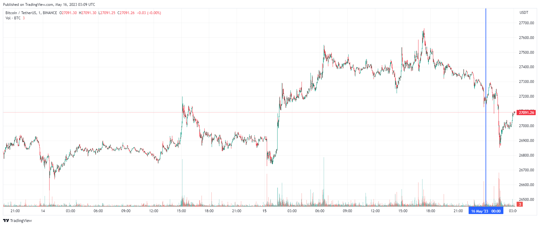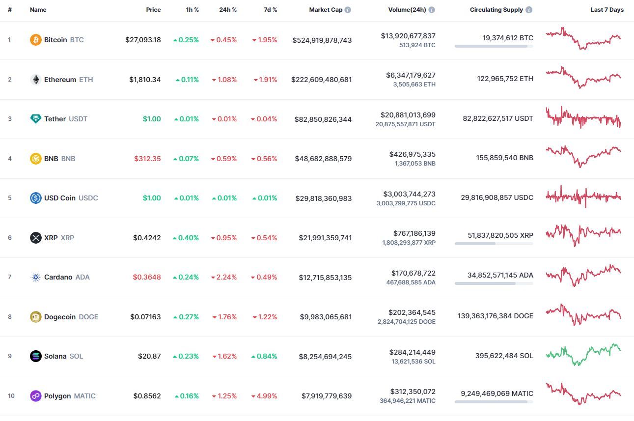 Биткоин (BTC), по данным ресурса CoinMarketCap, начал вторник с падения. По состоянию на 06:11 (МСК), криптовалюта торгуется по $27 091 (1 токен в рублях — ₽2,146,311). Минимум биткоина за 24 часа — $26 878, максимум — $27 646.