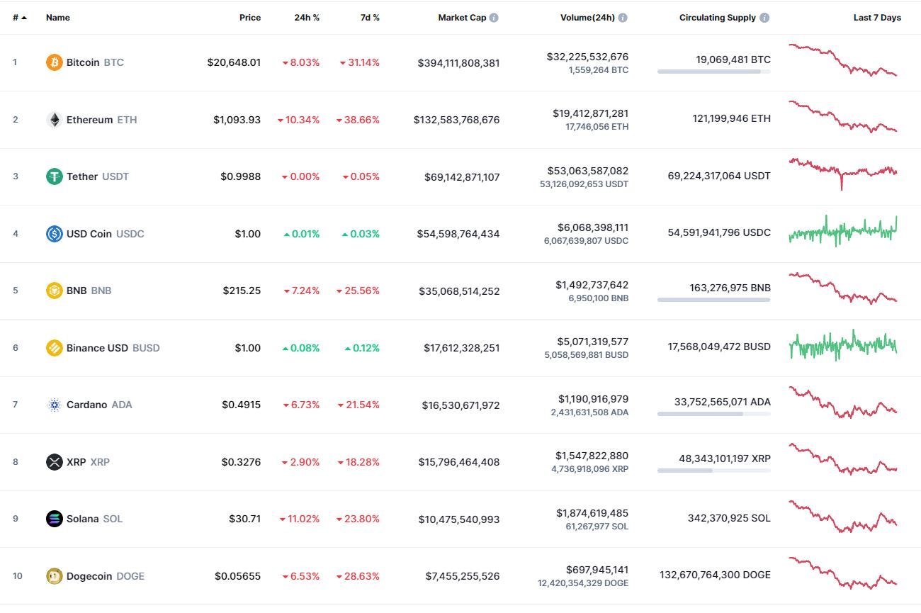 В топ-10 самых капитализированных криптовалют все монеты, за исключением стейблкоинов USD Coin и Binance USD, продемонстрировали отрицательную динамику в рамках суток и последних семи дней. Наибольшие потери за 24 часа зафиксированы у Solana (-11,02%), за неделю – у Ethereum (-38,66%).