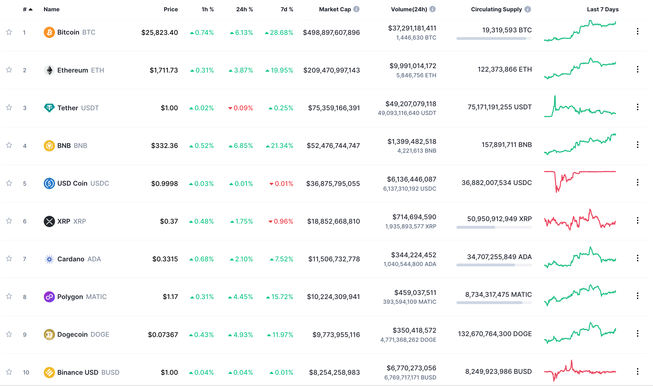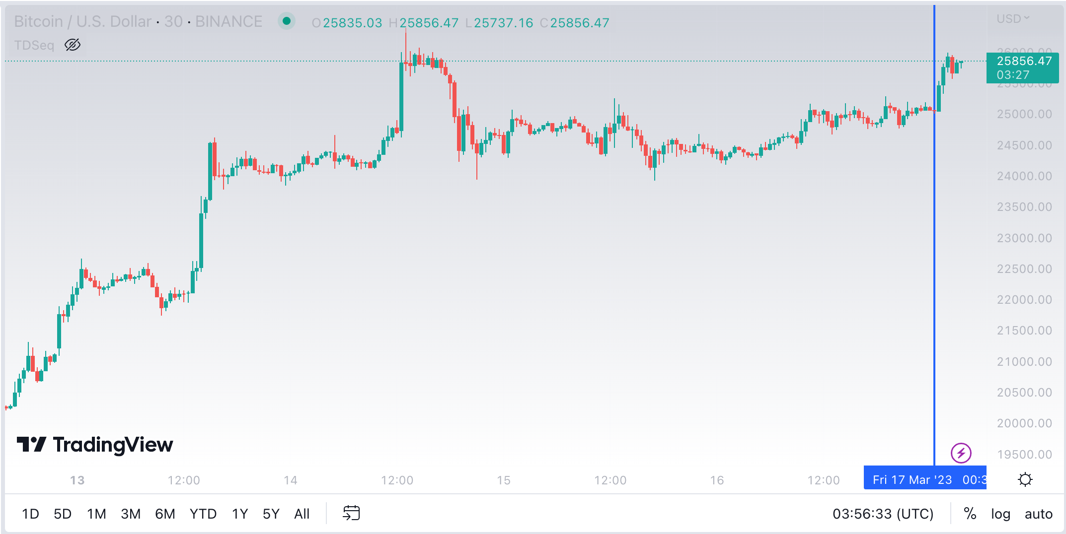 Биткоин (BTC) начал пятницу с незначительного роста. По состоянию на 07:00 (МСК), криптовалюта торгуется по $25 856 (1 токен в рублях — ₽1 980 908). За сутки курс биткоина вырос на 6%, при этом объем торгов сократился на 11%.