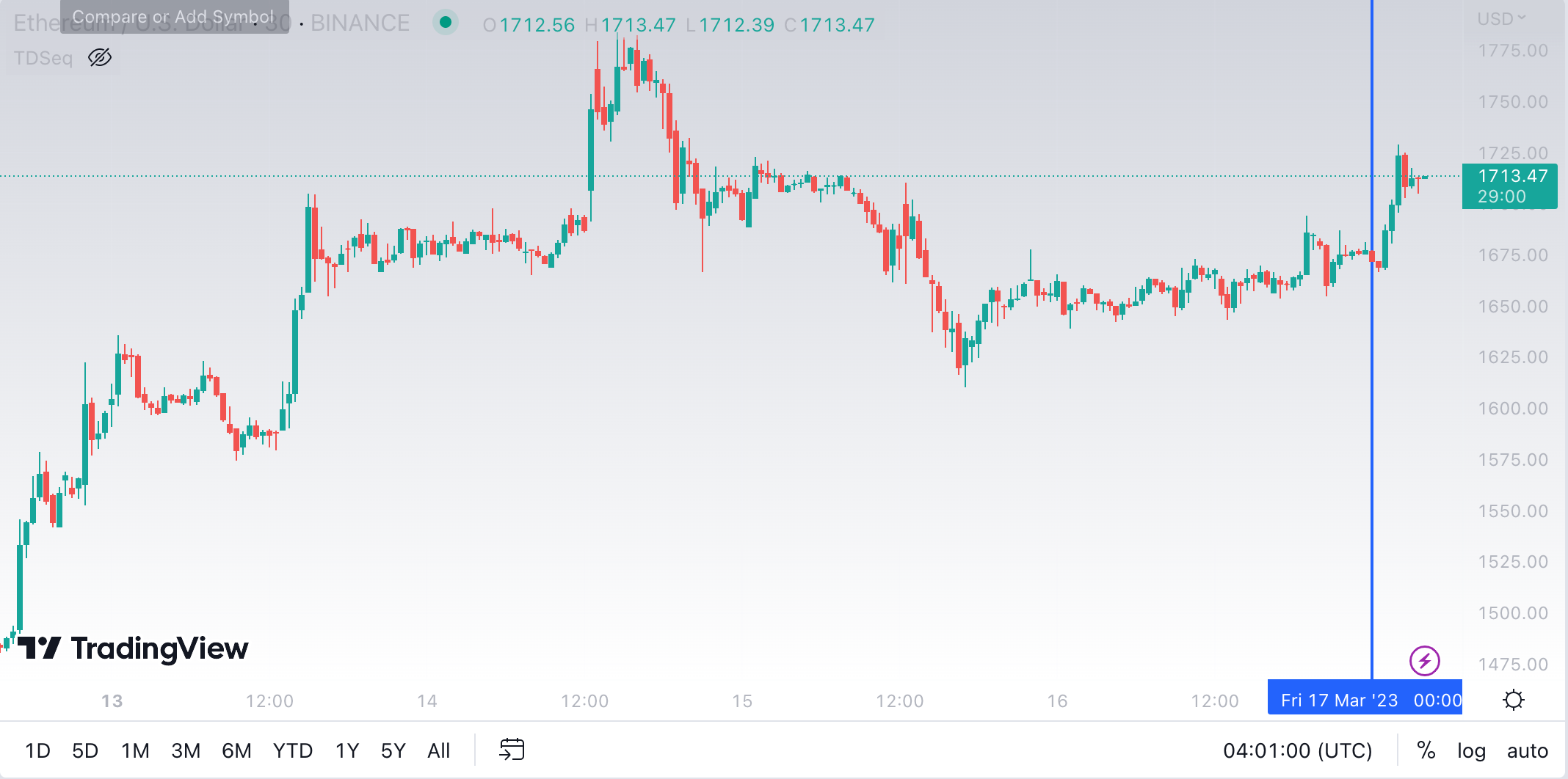 Вторая по капитализации криптовалюта Ethereum также начала день с роста. По состоянию на момент написания обзора, монета торгуется по $1713 (1 токен в рублях — ₽131 388). За сутки курс ETH вырос на 3,6%.