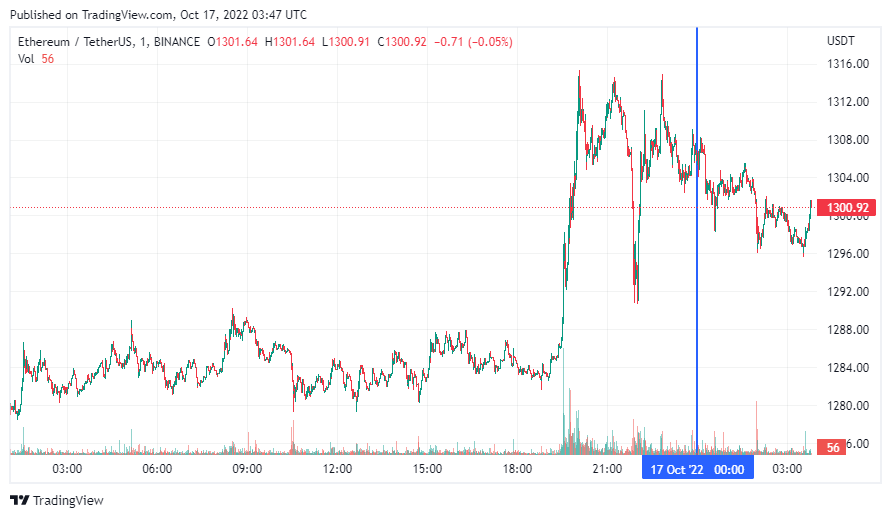 Вторая по капитализации криптовалюта Ethereum также начала день с падения. По состоянию на момент написания обзора, монета торгуется по $1300 (1 токен в рублях – ₽81,228).
