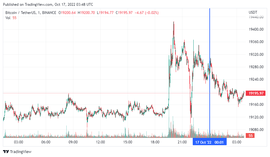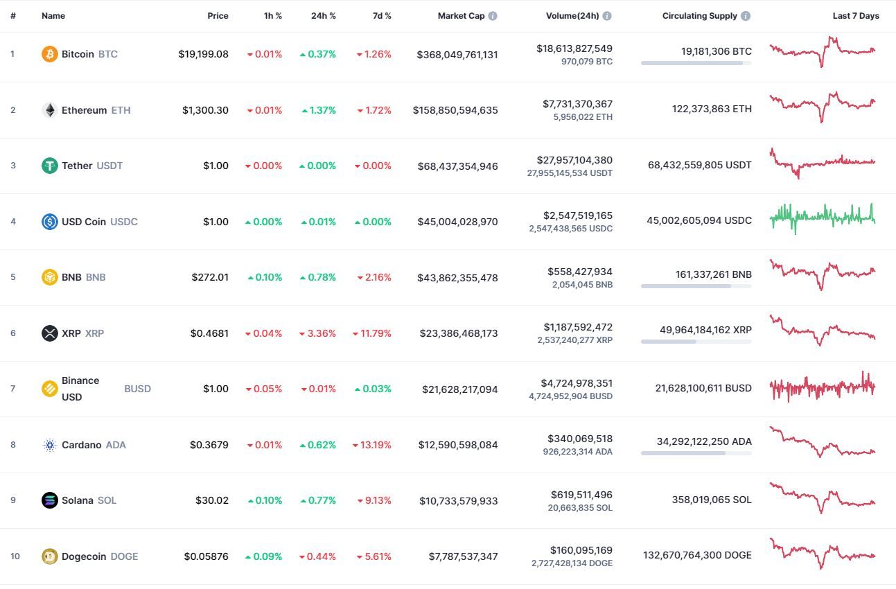Биткоин (BTC), по данным ресурса CoinMarketCap, начал понедельник с падения. По состоянию на 06:48 (МСК), криптовалюта торгуется по $19 195 (1 токен в рублях – ₽1,197,743). Минимум биткоина за 24 часа – $19 118, максимум – $19 389.