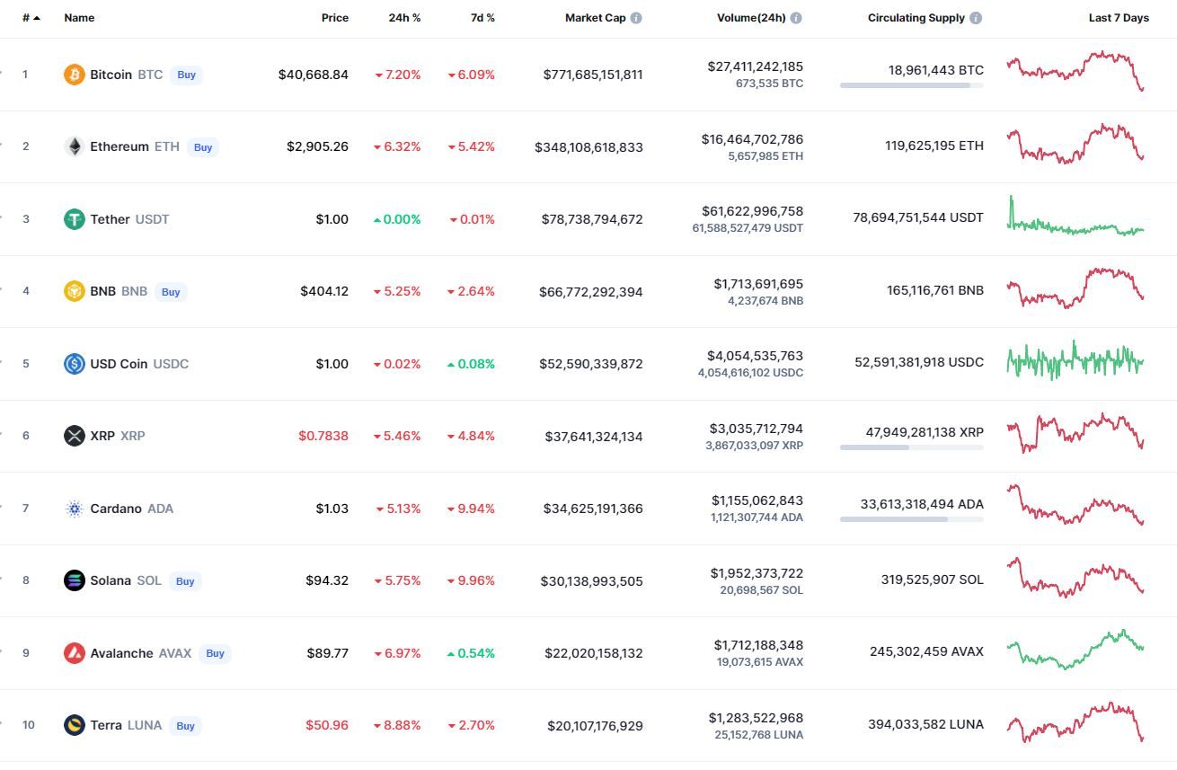 В топ-10 самых капитализированных криптовалют все монеты, за исключением стейблкоина Tether, продемонстрировали отрицательную динамику движения. Наибольшие потери зафиксированы у Terra (-8,88%). В рамках недели активнее других терял в цене Solana (-9,96%). Лучший результат за 7 дней зафиксирован у Avalanche (+0,54%).
