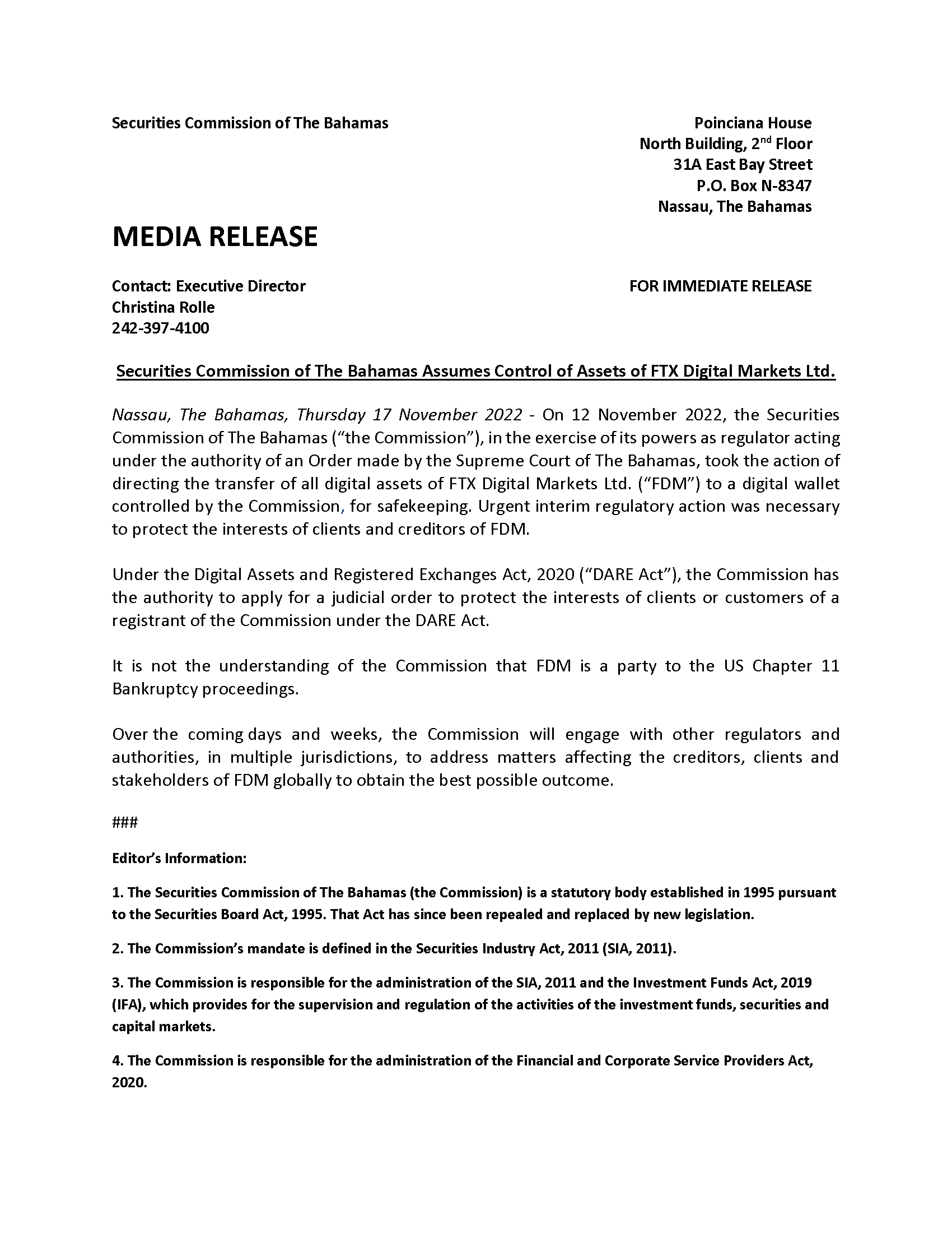 - Комиссия по ценным бумагам Багамских перевела активы местного подразделения криптобиржи FTX на собственный кошелек, чтобы организовать безопасное хранение криптовалюты для «защиты интересов клиентов» торговой платформы. Информация об этом появилась в микроблоге Комиссии.