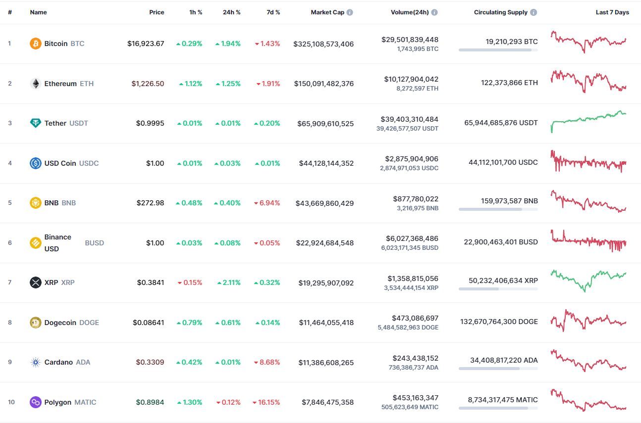 В топ-10 самых капитализированных криптовалют лучший результат за сутки (+2,11%) и неделю (+0,32%) зафиксирован у XRP. Активнее других в течение 24 часов (-0,12%) и семи дней (-16,15%) терял в цене Polygon.