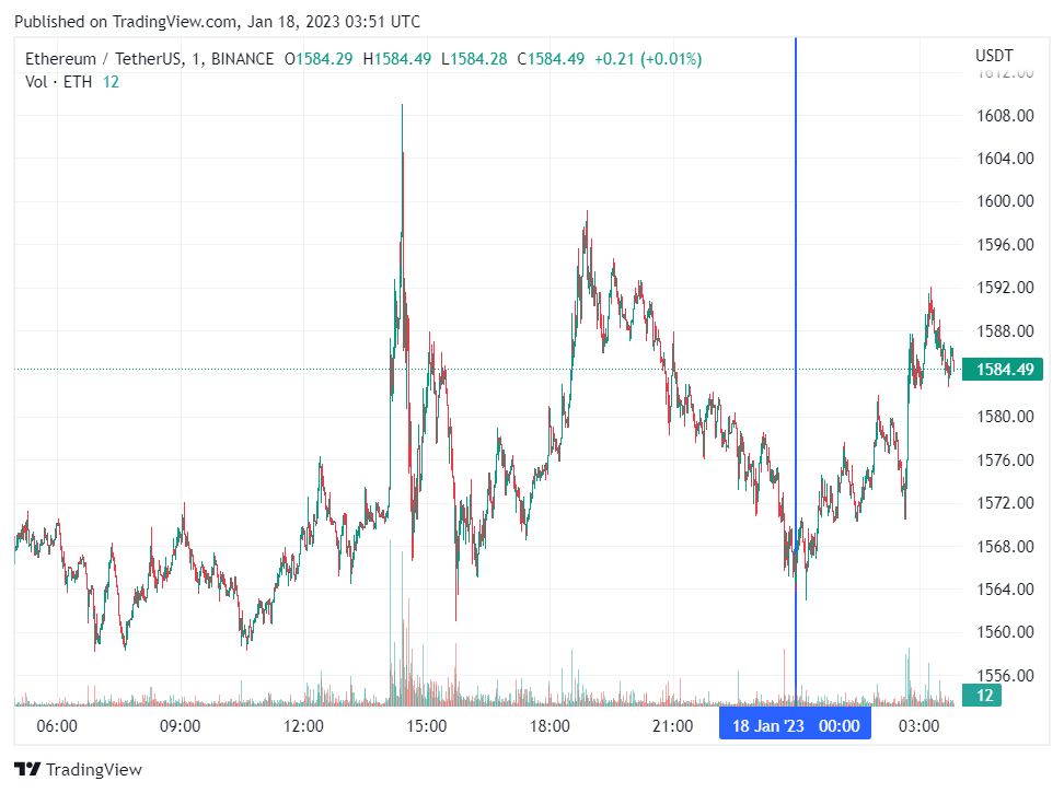 Вторая по капитализации криптовалюта Ethereum также начала день с небольшого роста. По состоянию на момент написания обзора, монета торгуется по $1584 (1 токен в рублях – 109,042).