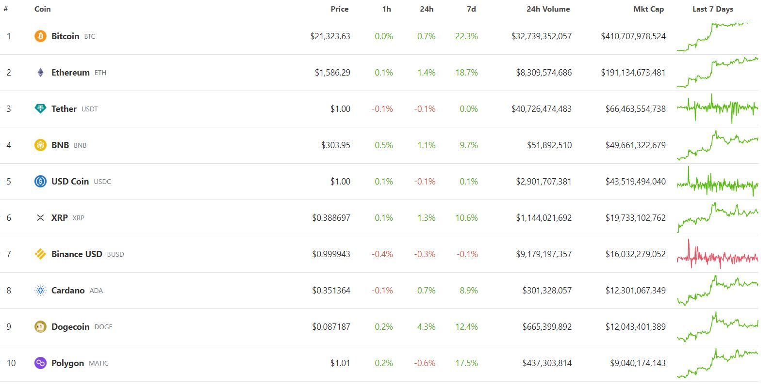 В топ-10 самых капитализированных криптовалют лучший результат за сутки зафиксирован у Dogecoin (+4,3%). В рамках недели активнее других рос биткоин (+22,3%). Наибольшие потери за 24 часа зафиксированы у Polygon (-0,6%). В рамках недели потери зафиксированы только у стейблкоина Binance USD.