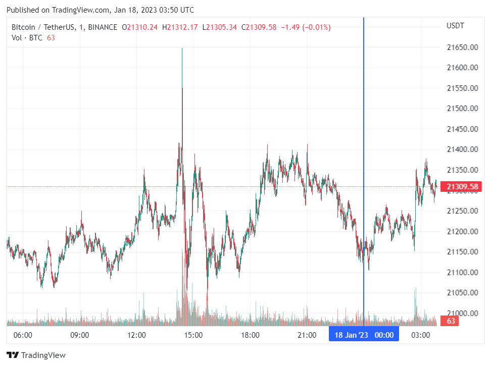 Биткоин (BTC), по данным ресурса CoinMarketCap, начал среду с небольшого роста. По состоянию на 06:51 (МСК), криптовалюта торгуется по $21 309 (1 токен в рублях – 1,465,962). Минимум биткоина за 24 часа – $21 070, максимум – $21 396.