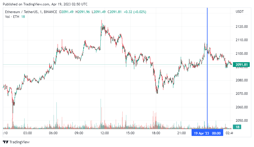 Вторая по капитализации криптовалюта Ethereum также начала день со снижения. По состоянию на момент написания обзора, монета торгуется по $2091 (1 токен в рублях — ₽171,184).