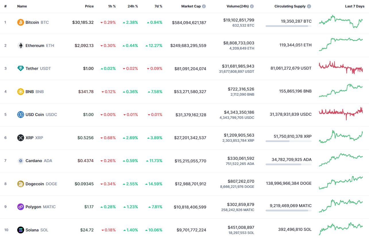 Биткоин (BTC), по данным ресурса CoinMarketCap, начал среду с падения. По состоянию на 05:53 (МСК), криптовалюта торгуется по $30 188 (1 токен в рублях — ₽2,471,035). Минимум биткоина за 24 часа — $29 457, минимум — $30 470.