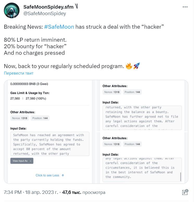 По словам разработчиков, хакер заберет 20% от украденных им ранее активов на $8.9 млн в качестве вознаграждения. Команда Safemoon хочет урегулировать конфликт мирно. Разработчики не будут предъявлять хакеру обвинения.