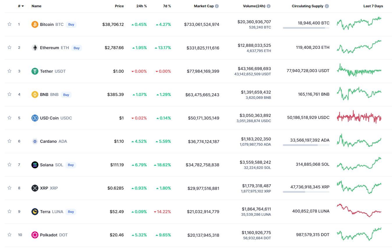 В топ-10 самых капитализированных криптовалют лучший результат за 24 часа (+6,79%) и неделю (+18,62%) зафиксирован у Solana. В течение суток все монеты, за исключением стейблкоинов Tether и USD Coin, демонстрировали позитивную динамику. В рамках недели наибольшие потери зафиксированы у Terra (-14,22%).