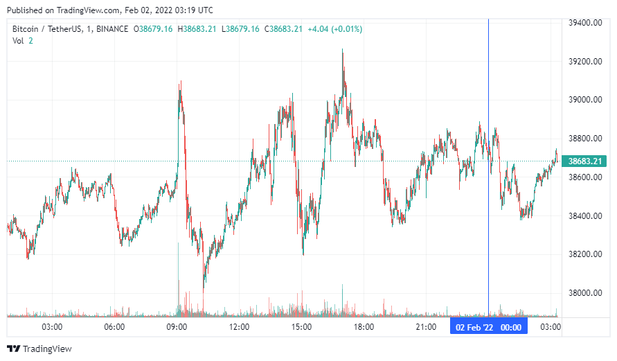 Биткоин (BTC) начал среду с падения, которое перешло в коррекцию. По состоянию на 06:19 (МСК), криптовалюта торгуется по $38 683. Минимум стоимости биткоина за 24 часа, по данным ресурса CoinMarketCap, зафиксирован на уровне $38 113, максимум – на высоте $39 115.