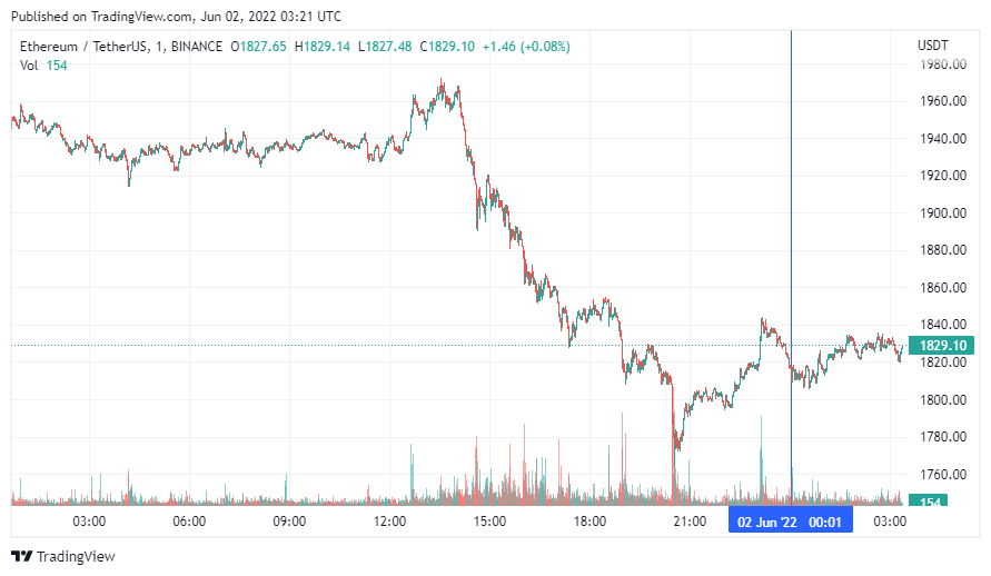 Вторая по капитализации криптовалюта Ethereum также начала день с боковика. По состоянию на момент написания новости монета торгуется по $1829.