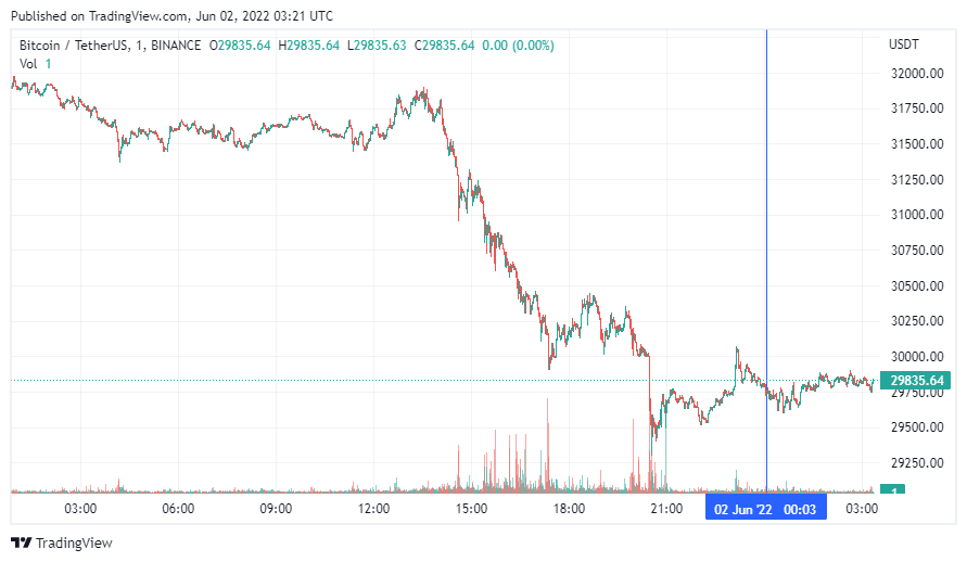 Биткоин (BTC) начал день с боковика. По данным ресурса CoinMarketCap, по состоянию на 06:21 (МСК), криптовалюта торгуется по $29 835. Минимум стоимости монеты за 24 часа зафиксирован на уровне $29 501, максимум – на высоте $31 848.