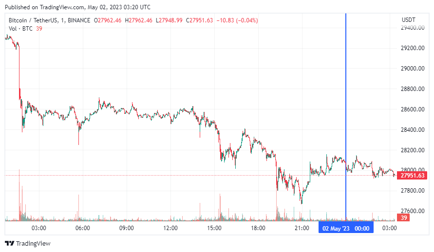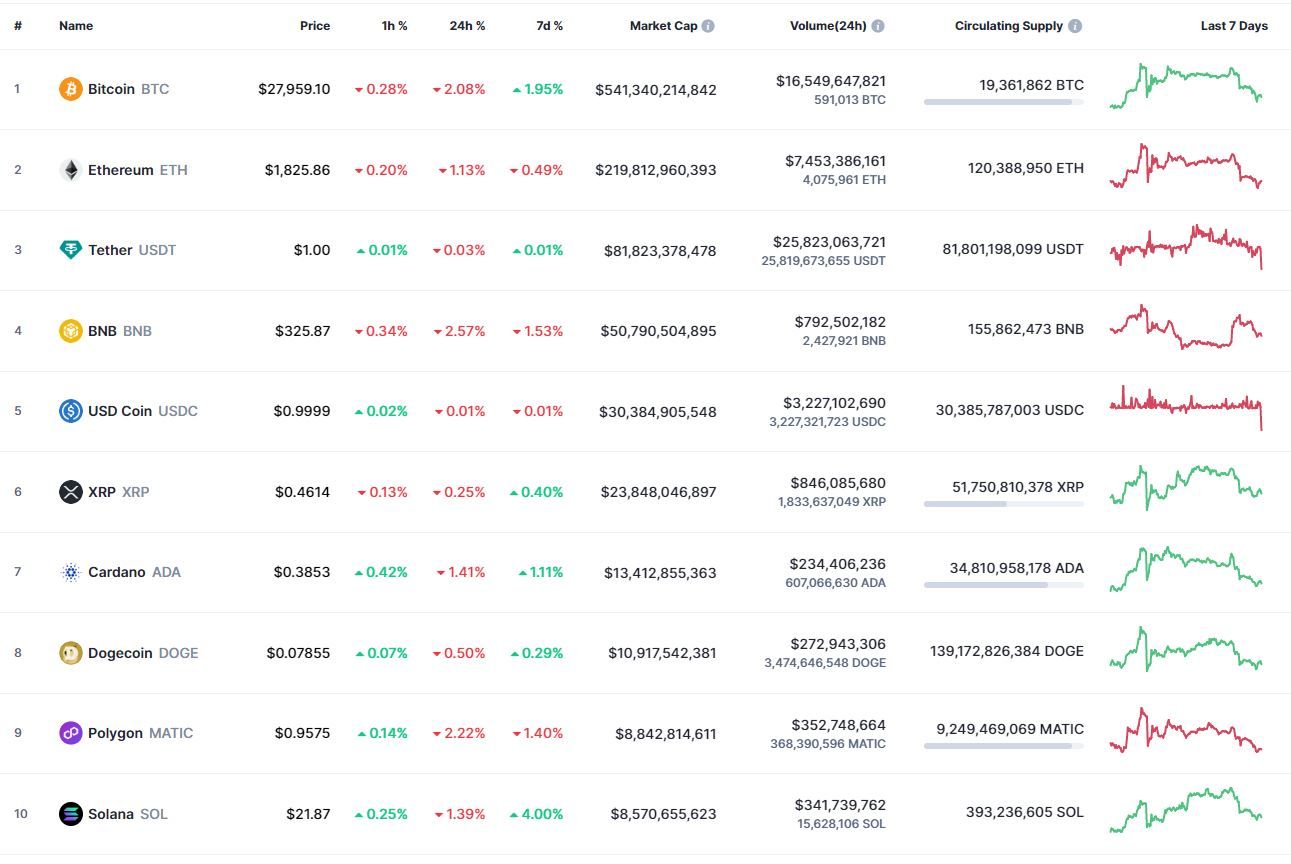 Биткоин (BTC), по данным ресурса CoinMarketCap, начал вторник с небольшого снижения. По состоянию на 06:20 (МСК), криптовалюта торгуется по $27 951 (1 токен в рублях — ₽2,248,095). Минимум биткоина за 24 часа — $27 680, максимум — $28 711.