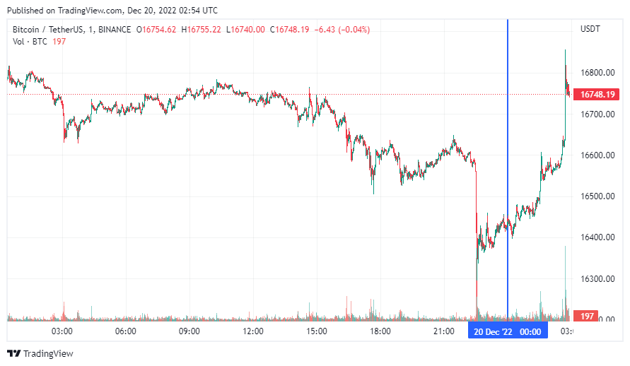 Биткоин (BTC), по данным ресурса CoinMarketCap, начал вторник со вспышки роста. По состоянию на 05:55 (МСК), криптовалюта торгуется по $16 748 (1 токен в рублях – ₽1,146,487). Минимум биткоина за 24 часа – $16 398, максимум – $16 782.