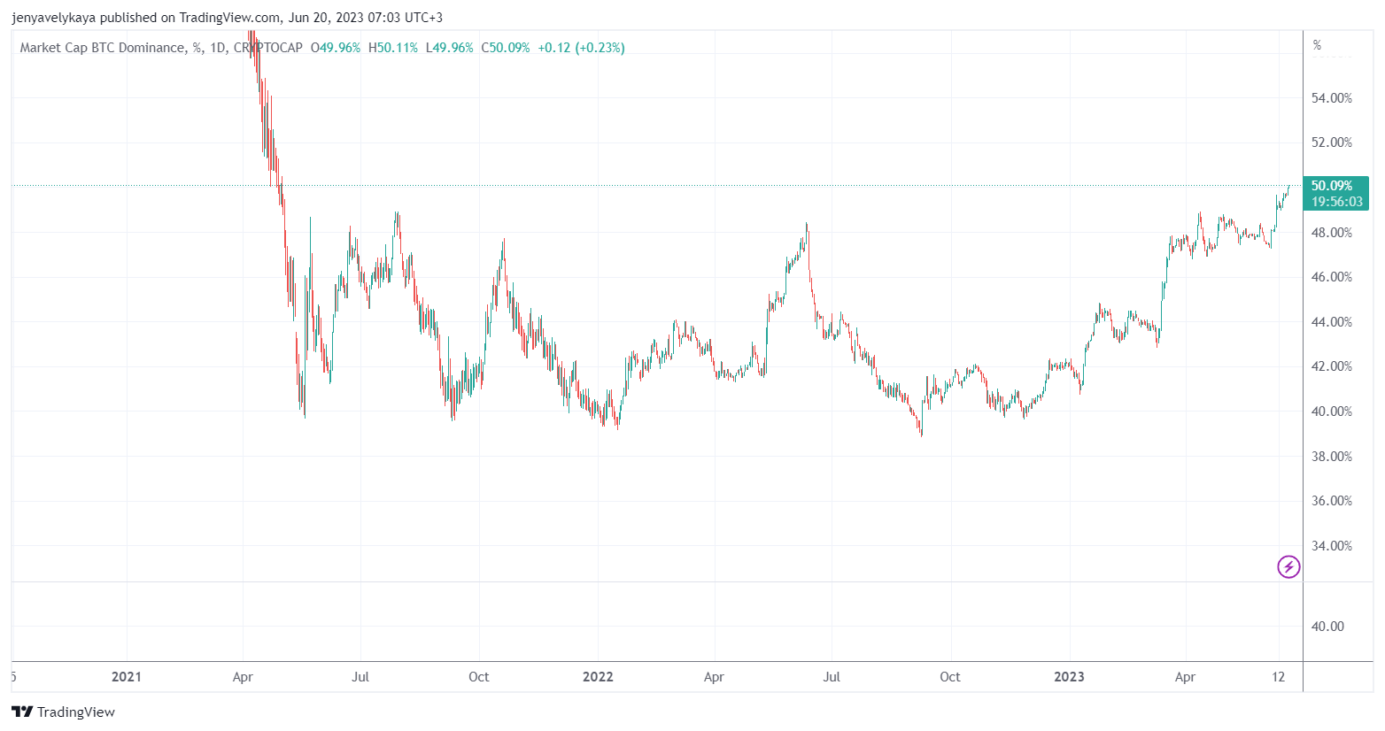 - Уровень доминирования биткоина превысил отметку 50%. В последний раз BTC демонстрировал аналогичные показатели в конце апреля 2021 года.
