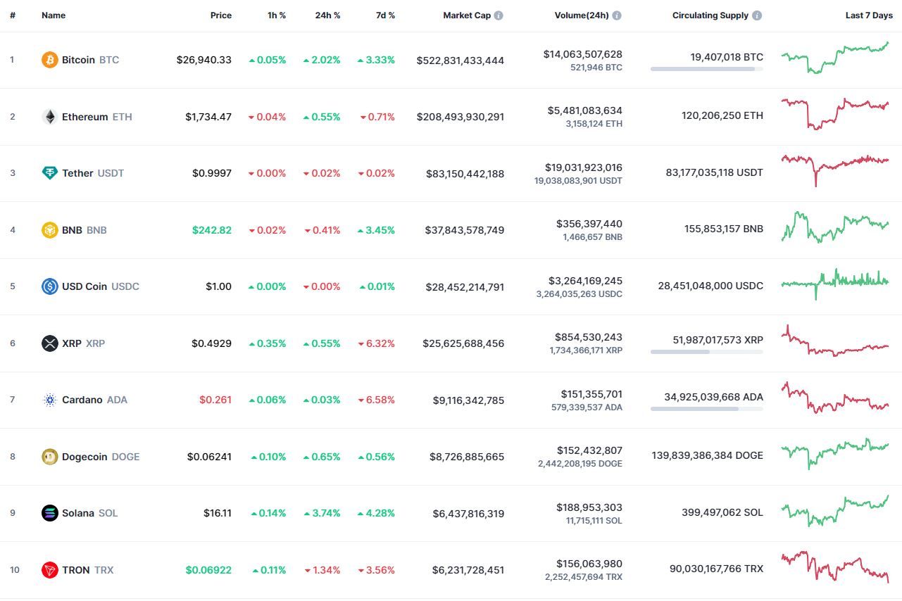 Биткоин (BTC), по данным ресурса CoinMarketCap, начал вторник с роста. По состоянию на 06:22 (МСК), криптовалюта торгуется по $26 938 (1 токен в рублях — ₽2,264,242). Минимум биткоина за 24 часа — $26 338, максимум — $27 147.
