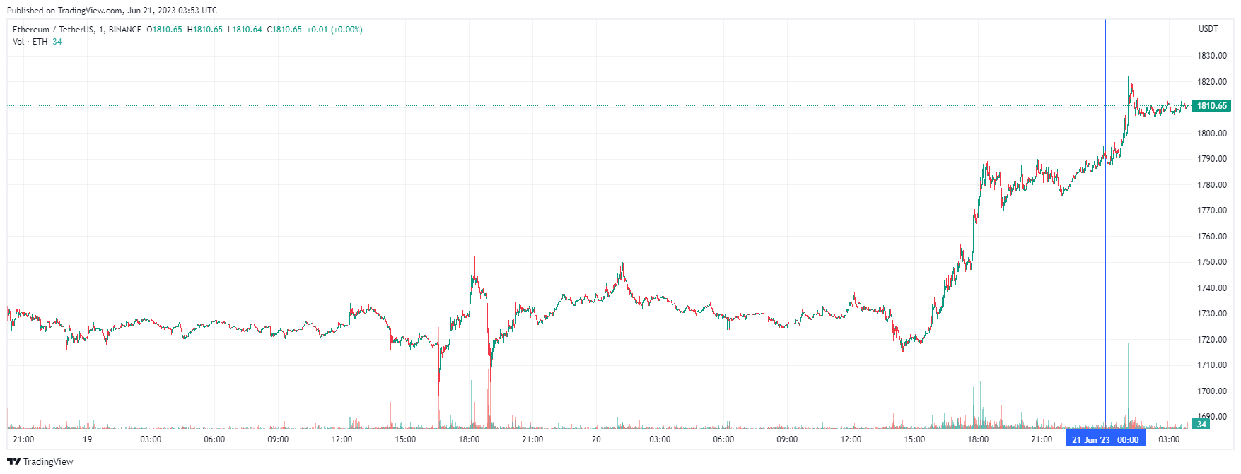 Вторая по капитализации криптовалюта Ethereum также начала день с роста. По состоянию на момент написания обзора, монета торгуется по $1810 (1 токен в рублях — ₽153,580).