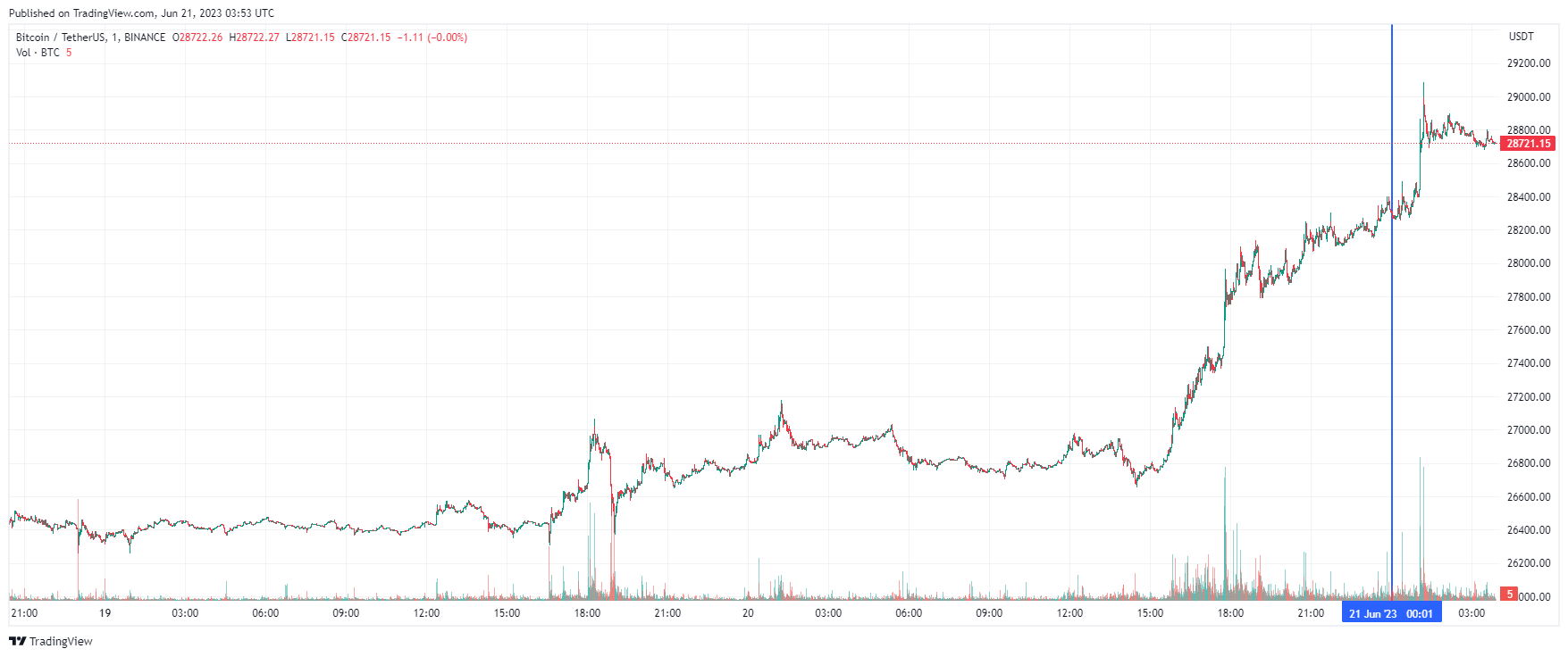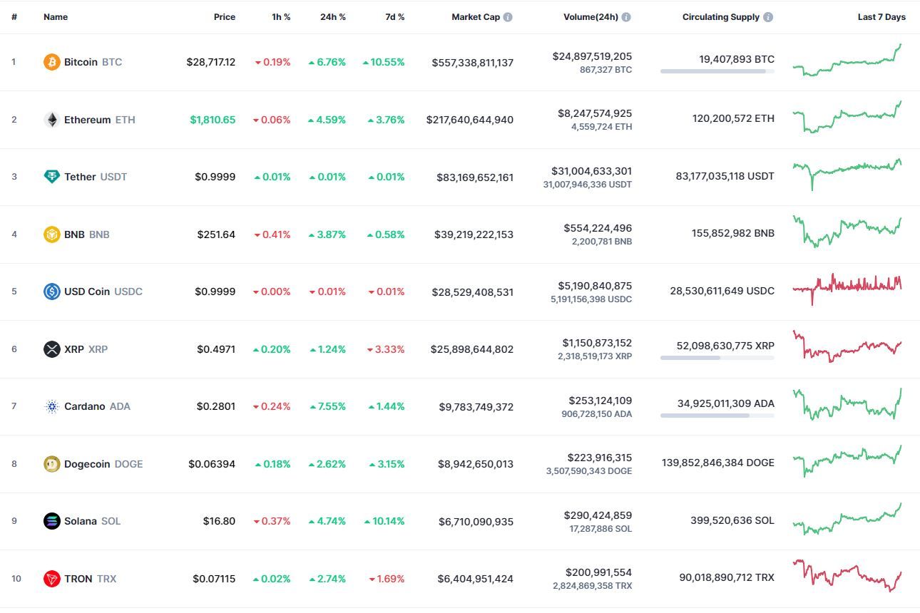 Биткоин (BTC), по данным ресурса CoinMarketCap, начал среду с роста. По состоянию на 06:54 (МСК), криптовалюта торгуется по $28 721 (1 токен в рублях — ₽2,433,690). Минимум биткоина за 24 часа — $26 668, максимум — $28 964.