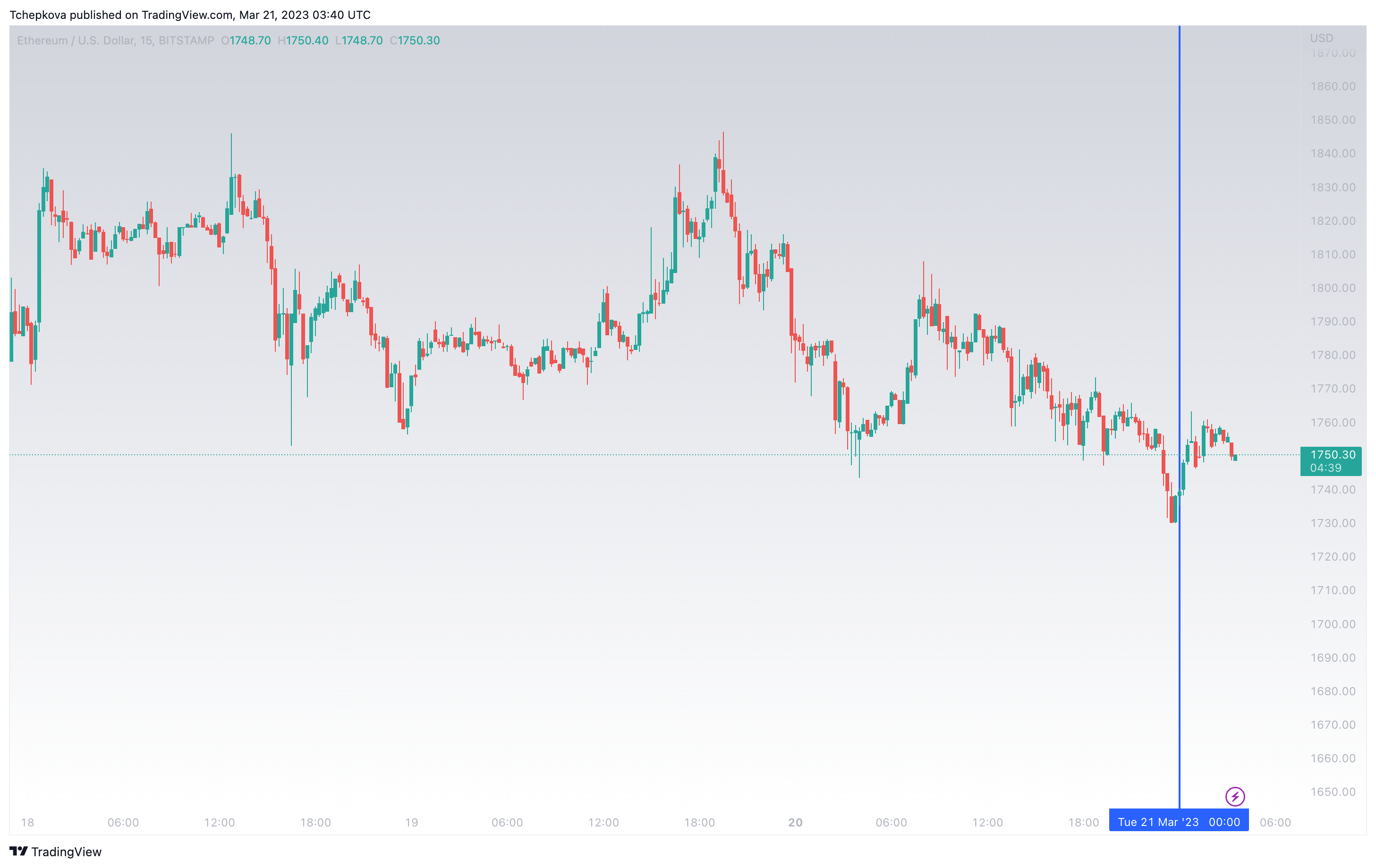 Вторая по капитализации криптовалюта Ethereum незначительно укрепляется в начале торгового дня во вторник. По состоянию на момент написания обзора, монета торгуется по $1750 (1 токен в рублях — ₽135 822). За сутки курс ETH почти не изменился.