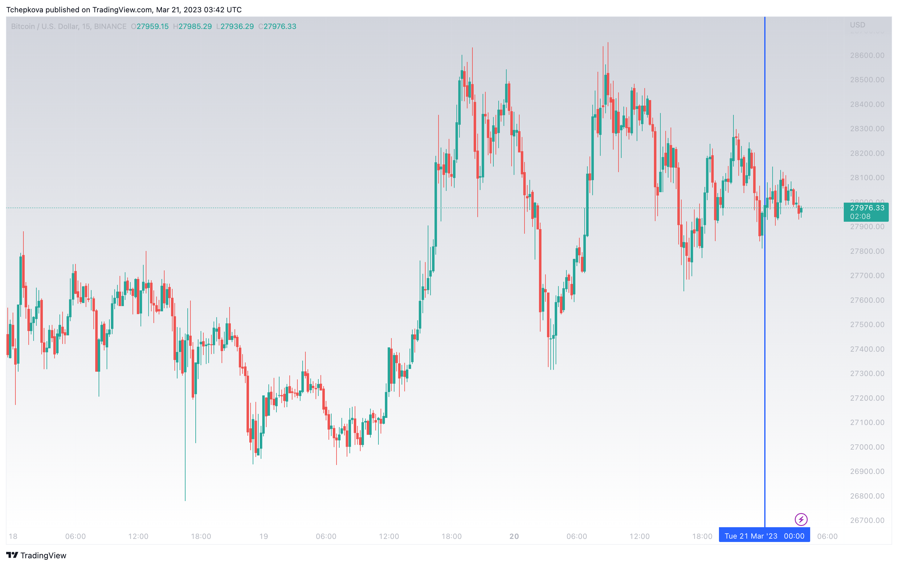 Биткоин (BTC) начал вторник с консолидации в узком диапазоне. По состоянию на 07:00 (МСК), криптовалюта торгуется по $27 976 (1 токен в рублях — ₽2 160 306). За сутки курс биткоина укрепился на 1,8%.