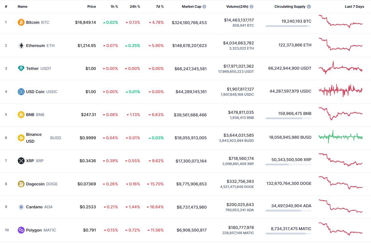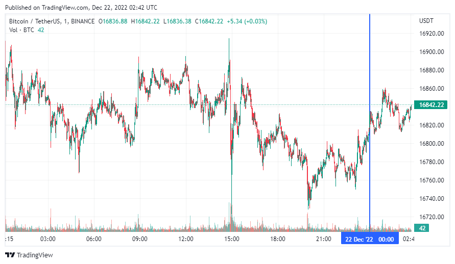 Биткоин (BTC), по данным ресурса CoinMarketCap, начал четверг с бокового движения. По состоянию на 05:43 (МСК), криптовалюта торгуется по $16 842 (1 токен в рублях – ₽1,202,684). Минимум биткоина за 24 часа – $16 755, максимум – $16 895.