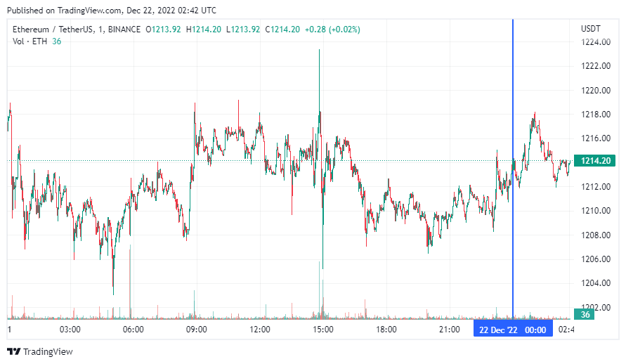 Вторая по капитализации криптовалюта Ethereum также начала день с бокового движения. По состоянию на момент написания обзора, монета торгуется по $1214 (1 токен в рублях – ₽86,721).