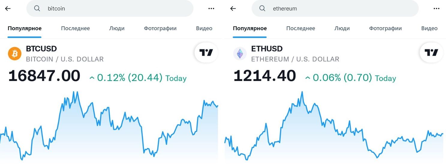 - В «Твиттере» появились графики биткоина и Ethereum. Чтобы посмотреть курс интересующей криптовалюты, нужно вбить в строку поиска ее название.