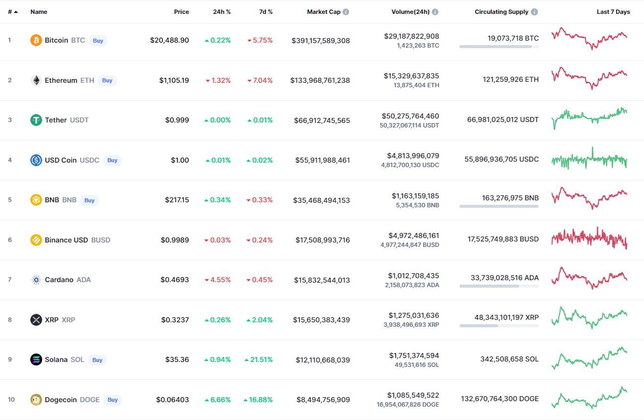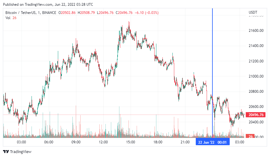 Биткоин (BTC), по данным ресурса CoinMarketCap, начал день с падения. По состоянию на момент написания новости, монета торгуется по $20 496. Минимум стоимости криптовалюты за 24 часа зафиксирован на уровне $20 394, максимум – на высоте $21 620.