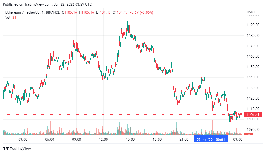 Вторая по капитализации криптовалюта также начала день с падения. По состоянию на момент написания обзора, монета торгуется по $1104.