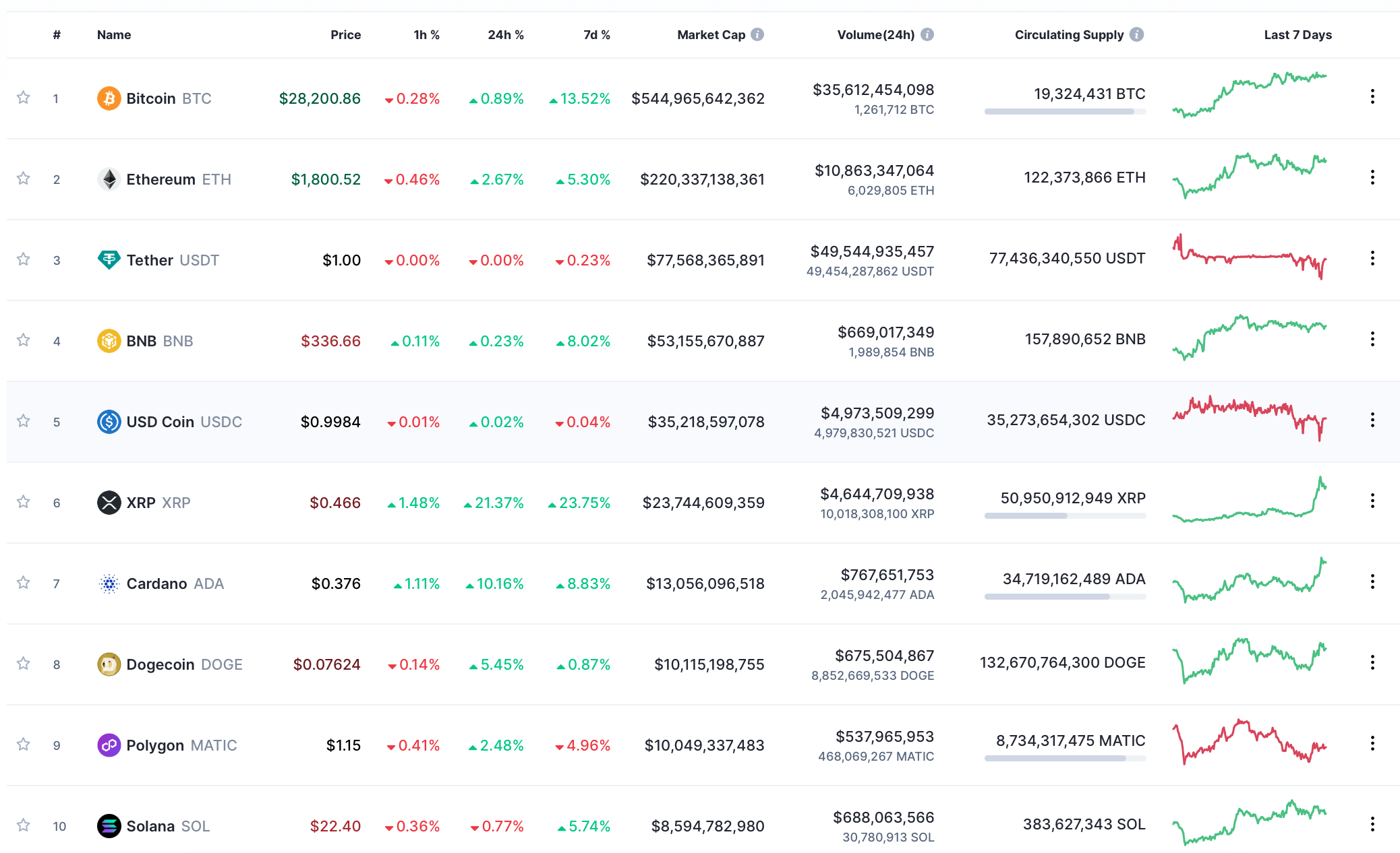 В топ-10 самых капитализированных криптовалют за сутки и за неделю больше всего вырос Ripple (XRP). Токен подорожал на 21%. Активнее других в рамках последних семи дней терял в цене MATIC (-5%).