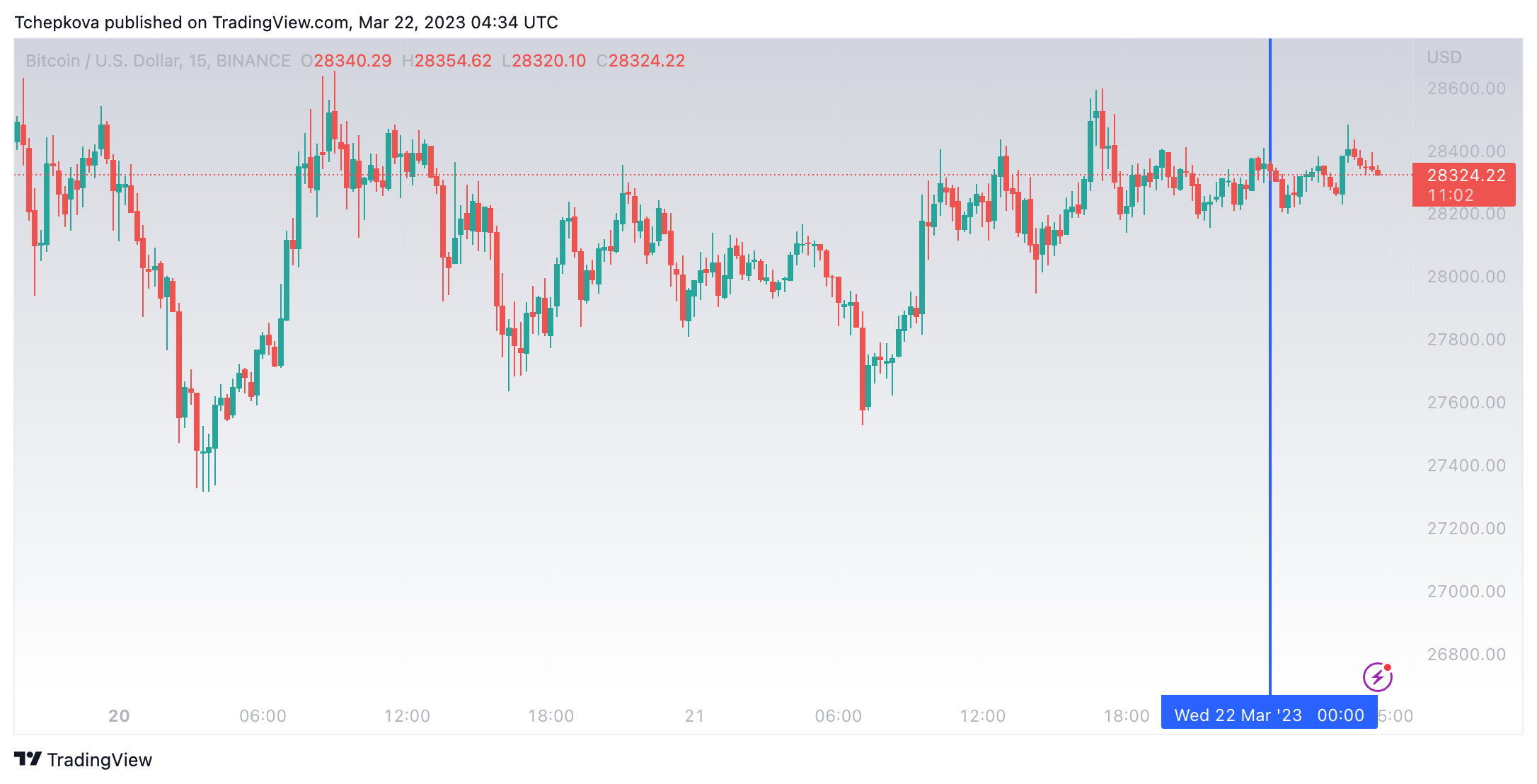 Биткоин (BTC) начал среду с консолидации в узком диапазоне. По состоянию на 07:30 (МСК), криптовалюта торгуется по $28 324 (1 токен в рублях — ₽2 179 089). За сутки курс биткоина вырос на 0,9%.