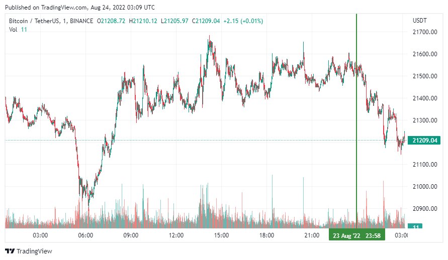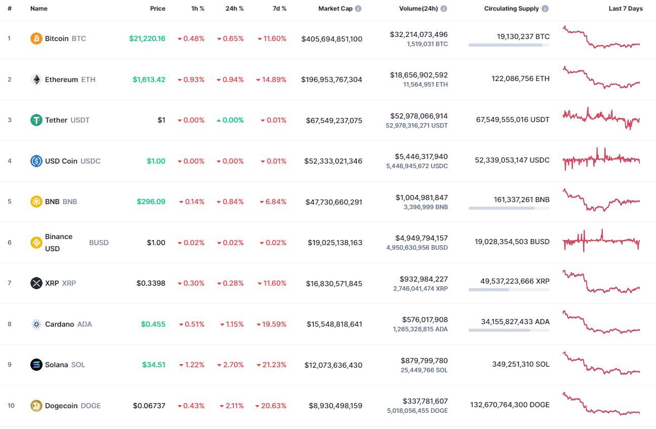 Биткоин (BTC), по данным ресурса CoinMarketCap, начал среду с падения. По состоянию на 06:09 (МСК), криптовалюта торгуется по $21 209. Минимум монеты за 24 часа – $20 955, максимум – $21 646.