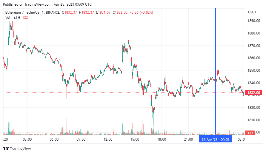 Вторая по капитализации криптовалюта Ethereum также начала день с бокового движения. По состоянию на момент написания обзора, монета торгуется по $1832 (1 токен в рублях — ₽149,431).