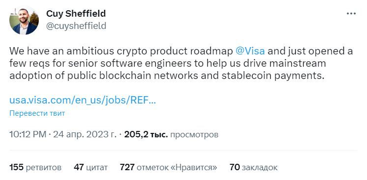 Sponsored- Платежная система Visa ищет инженеров для своего криптопроекта. Информацией об этом в микроблоге поделился глава криптоотдела компании Кью Шеффилд.