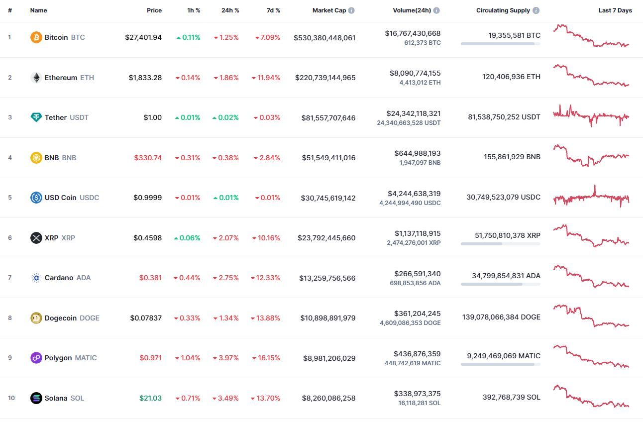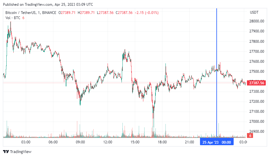 Биткоин (BTC), по данным ресурса CoinMarketCap, начал вторник с бокового движения. По состоянию на 06:09 (МСК), криптовалюта торгуется по $27 387 (1 токен в рублях — ₽2,233,572). Минимум биткоина за 24 часа — $27 070, максимум — $27 786.