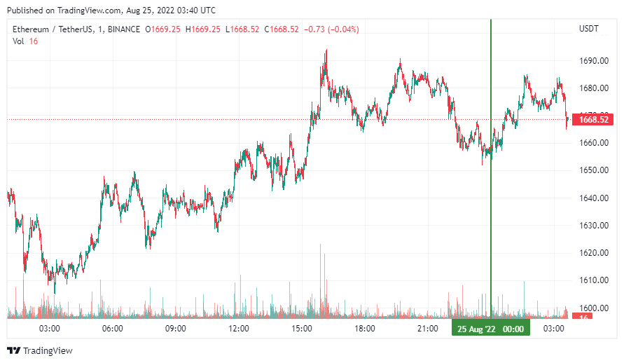 Вторая по капитализации криптовалюта Ethereum также начала день с небольшого роста. По состоянию на момент написания обзора, монета торгуется по $1668 (1 токен в рублях – ₽100,272).