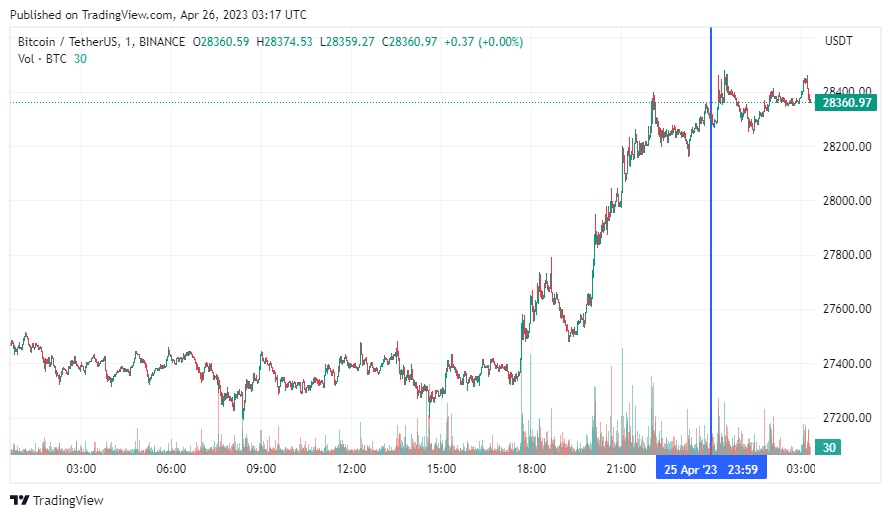 Биткоин (BTC), по данным ресурса CoinMarketCap, начал среду с бокового движения. По состоянию на 06:18 (МСК), криптовалюта торгуется по $28 360 (1 токен в рублях — ₽2,314,763). Минимум биткоина за 24 часа — $27 207, максимум — $28 463.