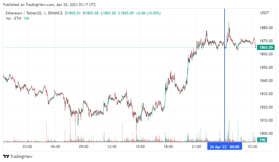 Вторая по капитализации криптовалюта Ethereum также начала день с бокового движения. По состоянию на момент написания обзора, монета торгуется по $1865 (1 токен в рублях — ₽152,315).