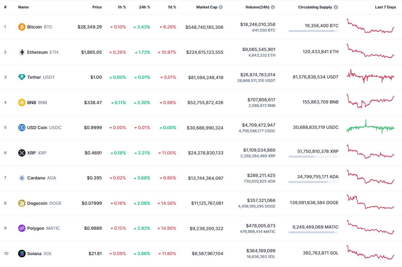 В топ-10 самых капитализированных криптовалют лучший результат за сутки зафиксирован у Cardano (+3,68%). В рамках недели все монеты, за исключением стейблкоина USD Coin, теряли в цене. Наибольшие потери за семь дней зафиксированы у Polygon (-14,90%). В рамках суток все монеты, за исключением USD Coin, демонстрировали позитивную динамику.