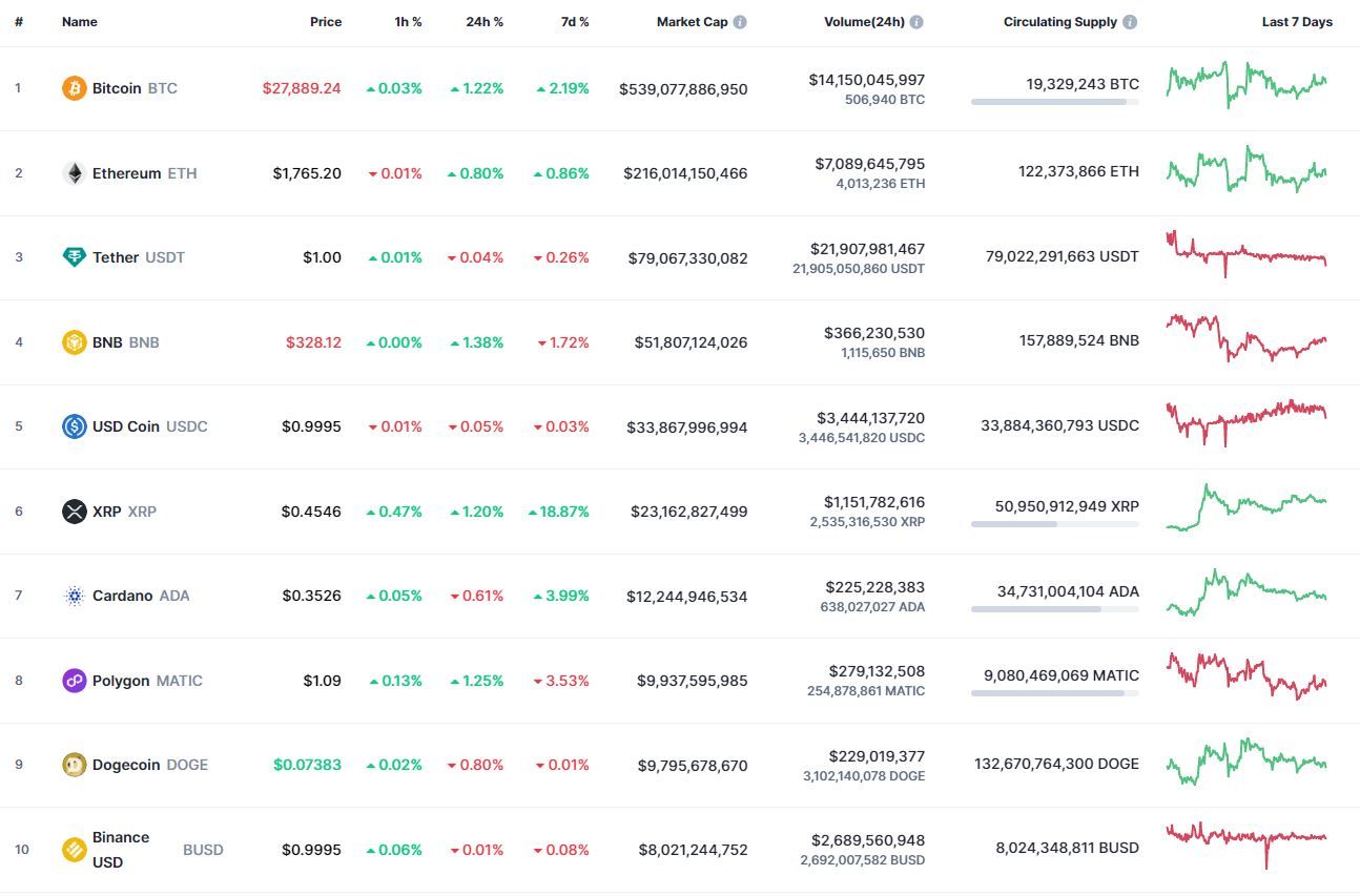 В топ-10 самых капитализированных криптовалют лучший результат за сутки зафиксирован у BNB (+1,38%), за неделю — у XRP (+18,87%). В рамках 24 часов активнее других терял в цене Dogecoin (-0,80%). Наибольшие потери за последние семь дней зафиксированы у Polygon (-3,53%).