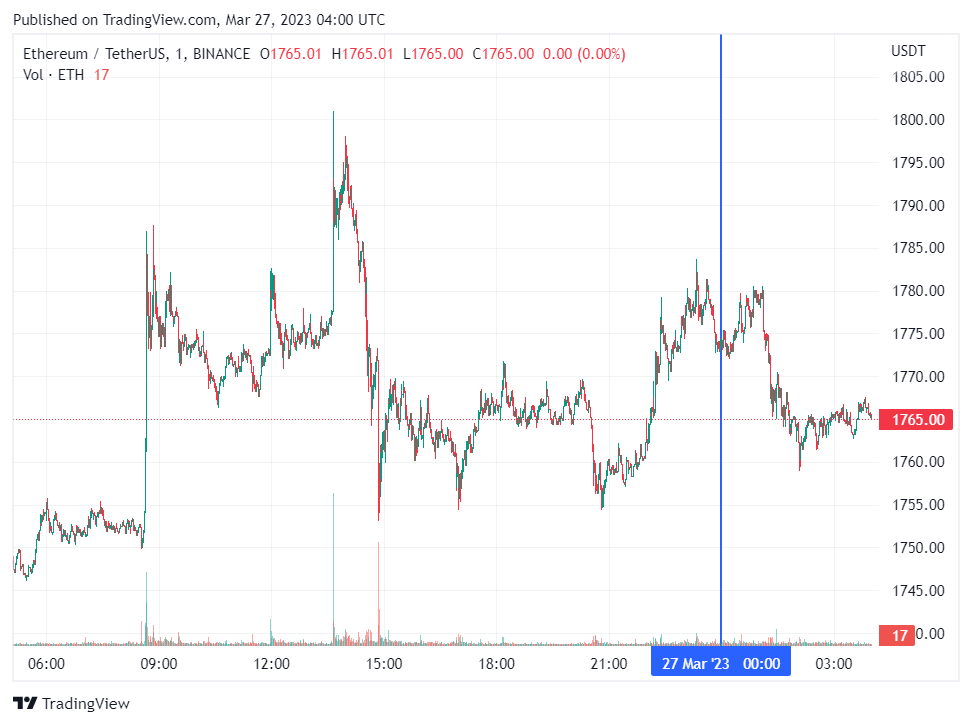 Вторая по капитализации криптовалюта Ethereum также начала день с падения. По состоянию на момент написания обзора, монета торгуется по $1765 (1 токен в рублях — ₽135,686).